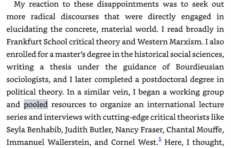 By the way I learned yesterday that Gabriel Rockhill lately runs his Critical Theory Workshop, described in the book as the product of ‘pool[ing resources]’ in activist circles, with a grant from the Herbert Marcuse Society.
